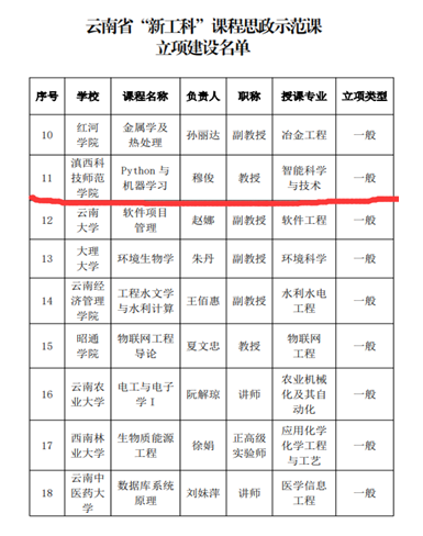 9月9日,在云南省课程思政教育联盟《关于公布云南省“新工科”课程思政示范课立项建设名单的通知》中,我校信息学院教师穆俊负责建设的《Python与机器学习》喜获立项。